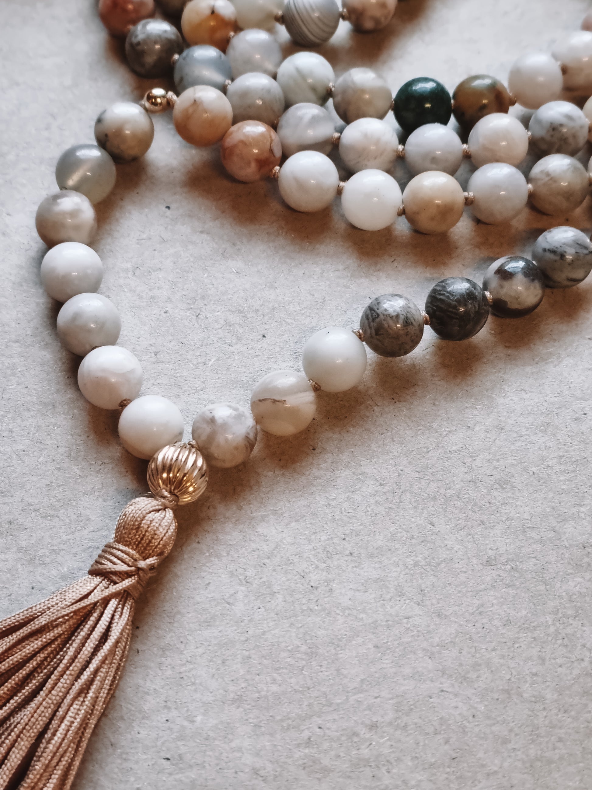 En Mantra mala har 108 perler, som har en dyb symbolik i mange spirituelle traditioner. 108 betragtes som et helligt tal, der repræsenterer enhed, fuldendelse og spirituel udvikling. Ved at bruge en mala bringer du intention og betydning ind i din meditation, hvilket kan styrke din praksis.