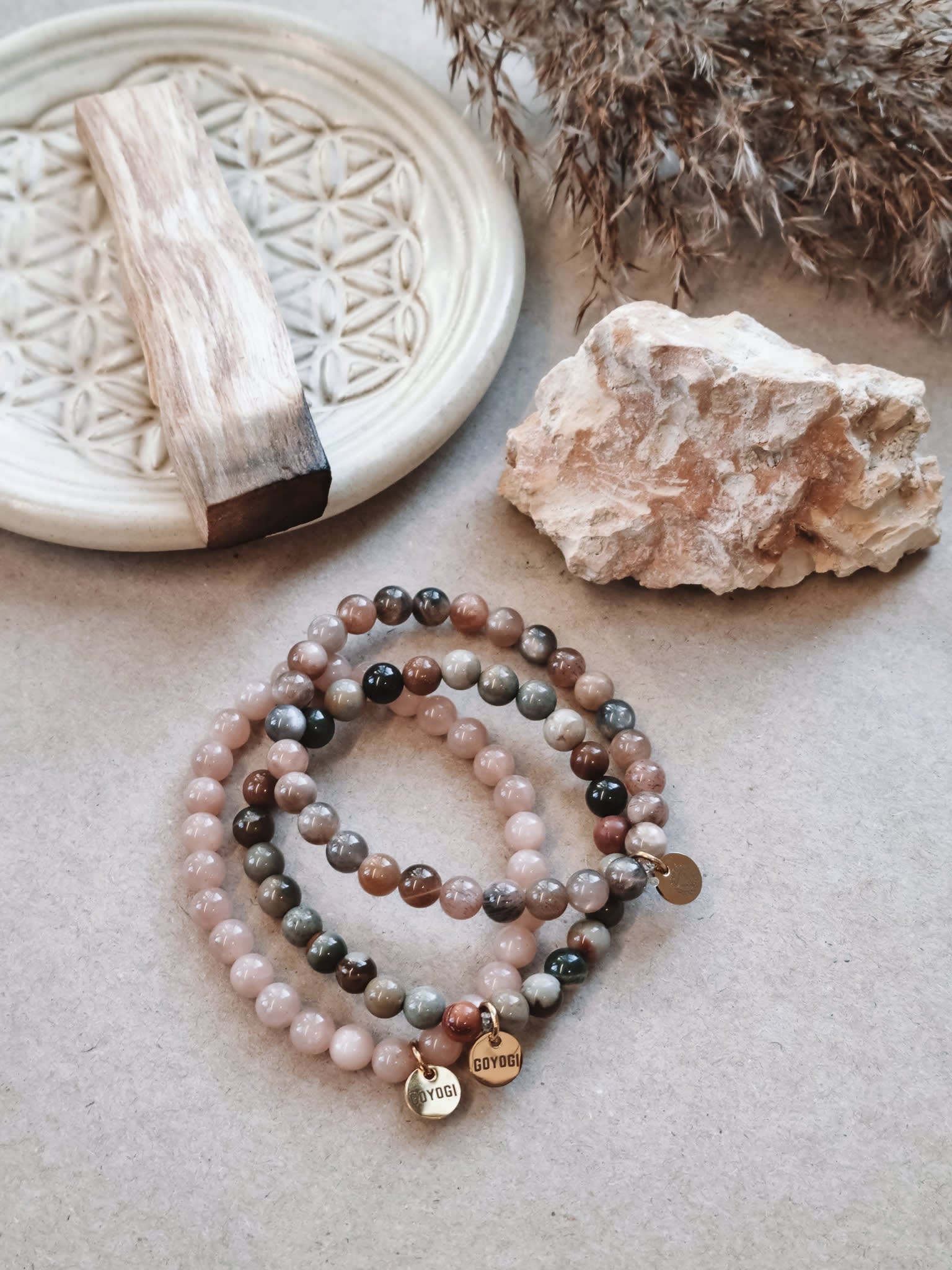 Mantra ENERGY stack med tre armbånd i henholdsvis polykrom jaspis, solsten og sort månesten.