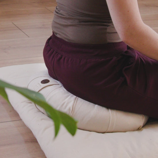 Den halvmåneformede meditationspude er designet til at støtte dine hofter og hjælpe dig med at sidde behageligt i meditation. Den giver en stabil siddeflade og plads til at trække anklerne tæt ind til kroppen, hvilket sikrer en korrekt og afslappet holdning.