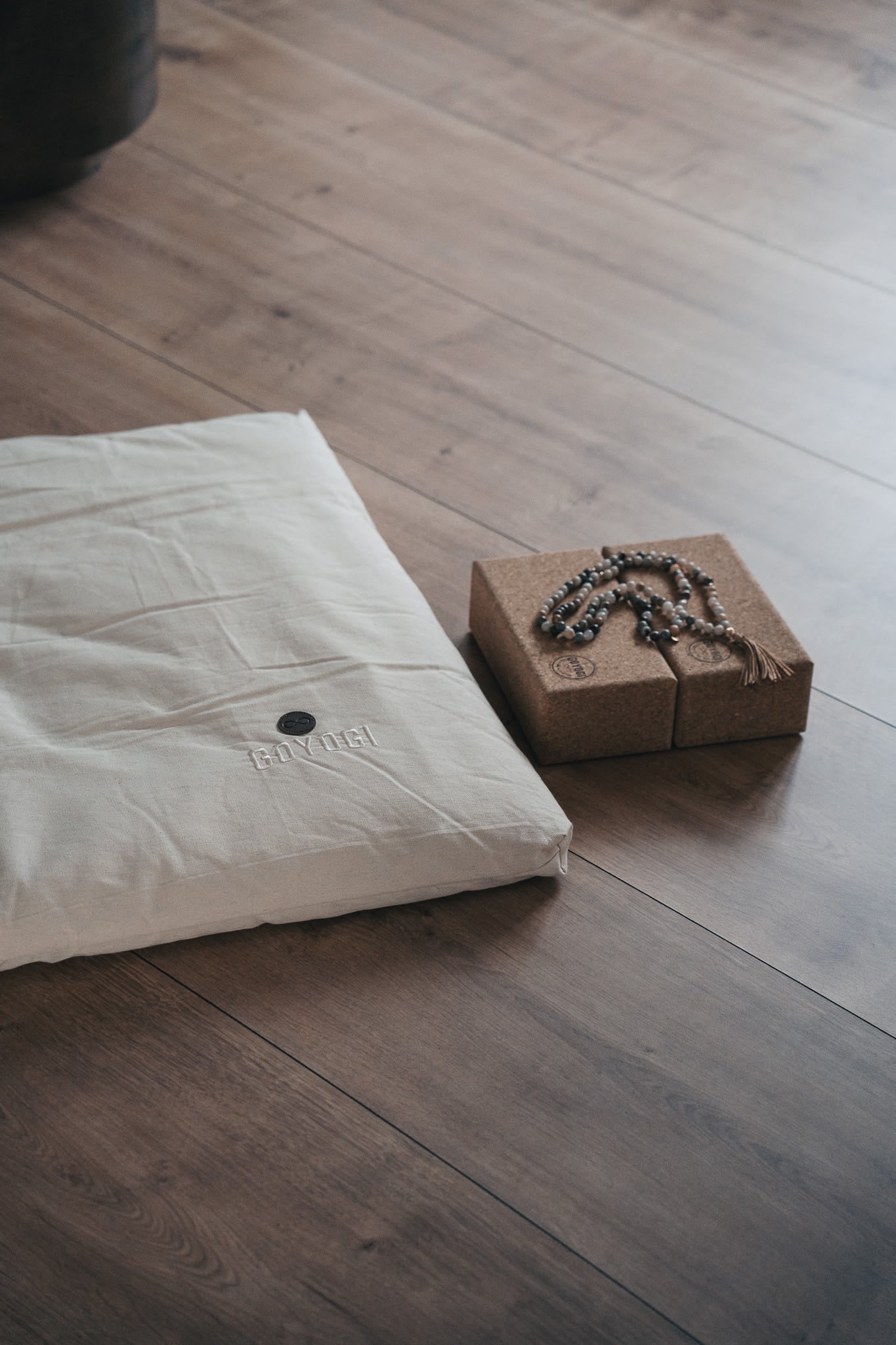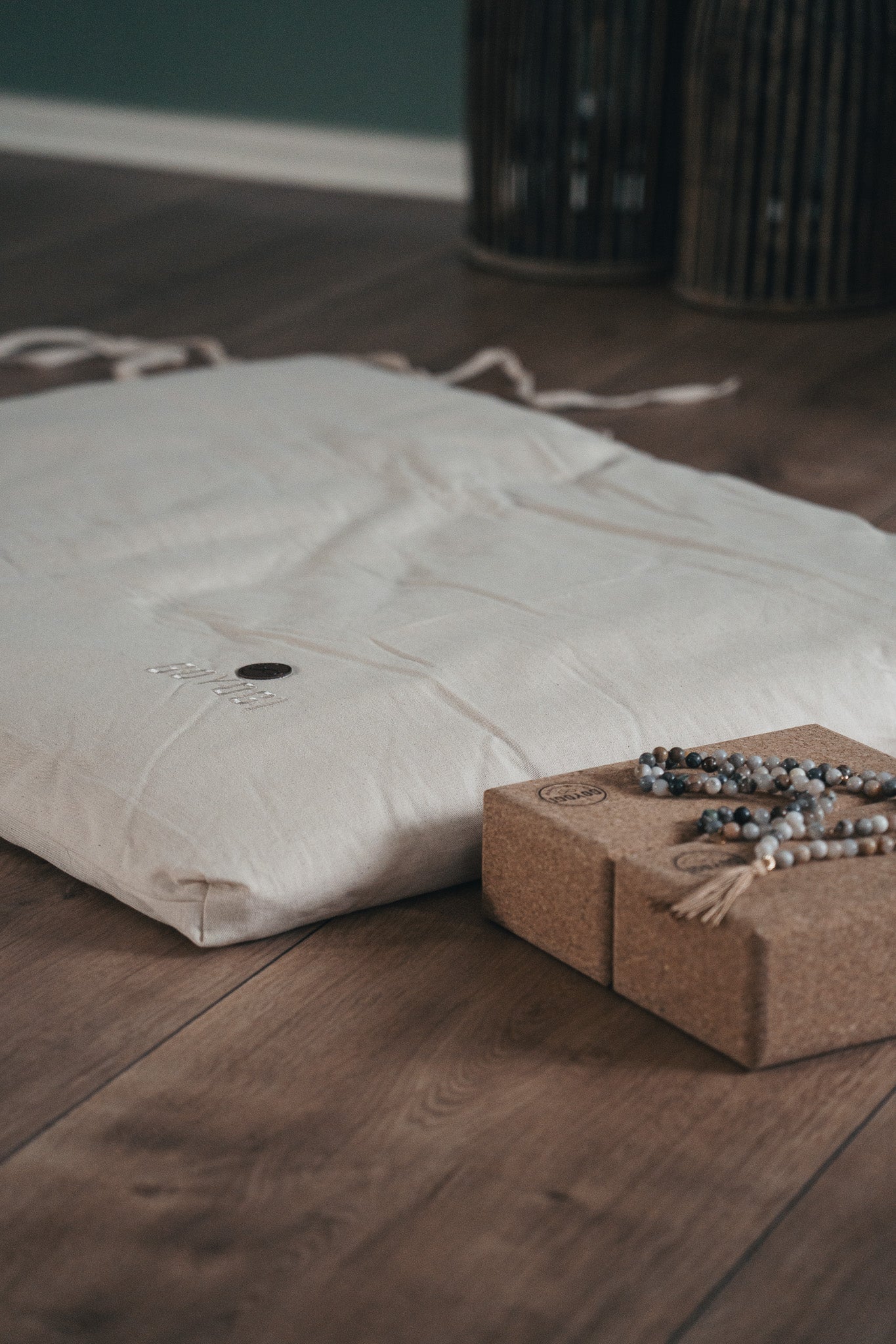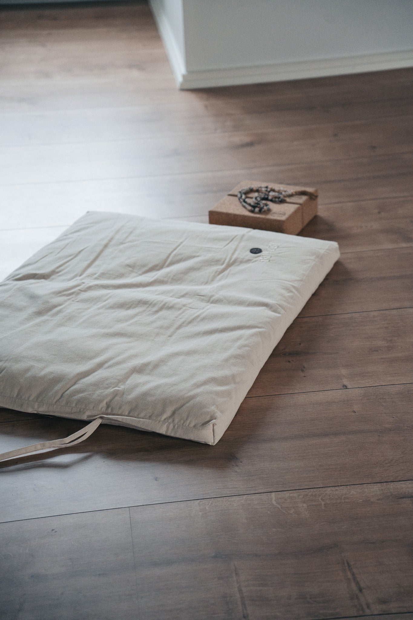 Denne zabuton er en gulvpude designet til at give støtte til knæ, underben og ankler under meditation. Med en tykkelse på 4 cm er den foldbar og udstyret med bindebånd, der gør den nem at transportere og opbevare.