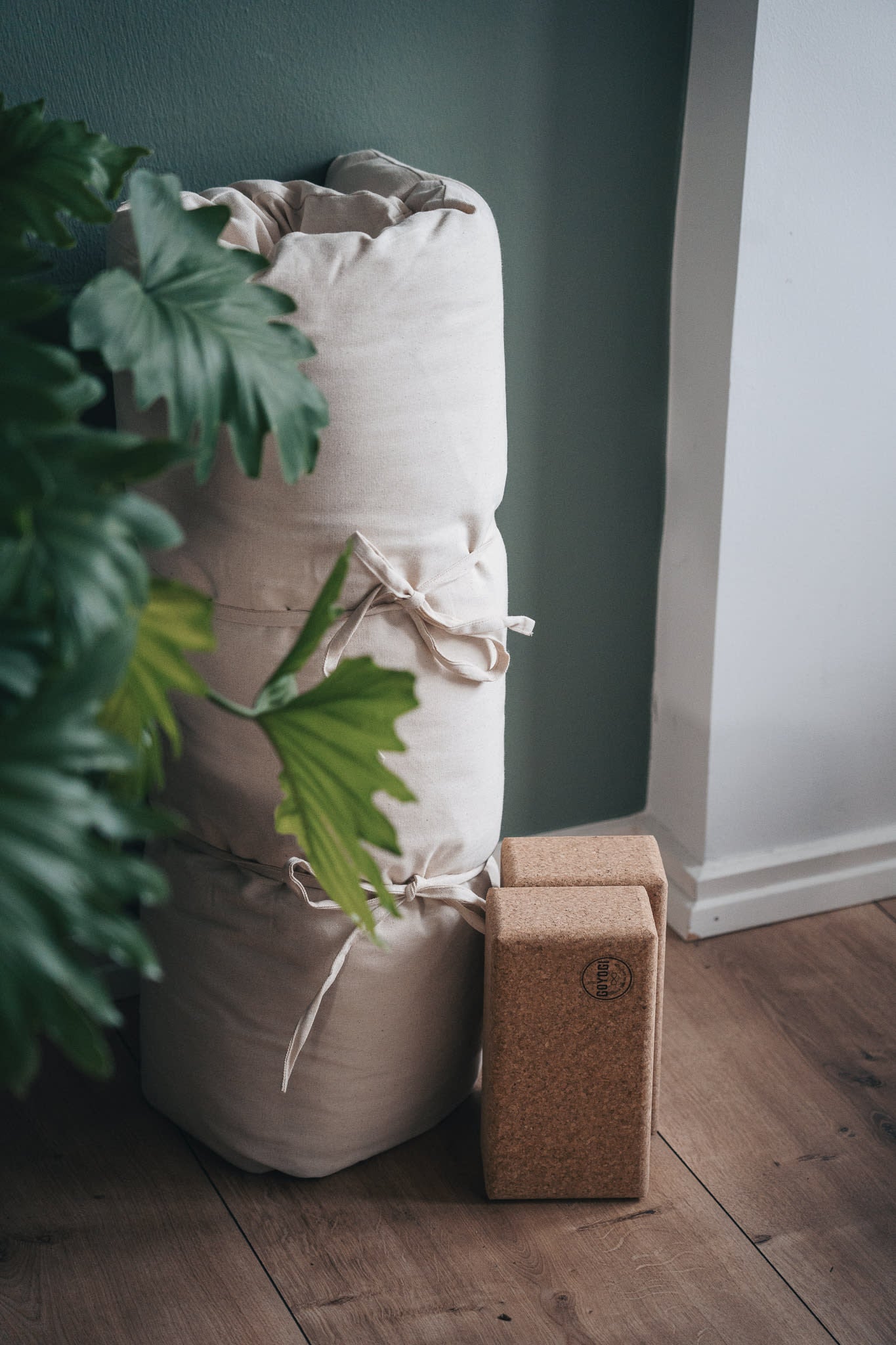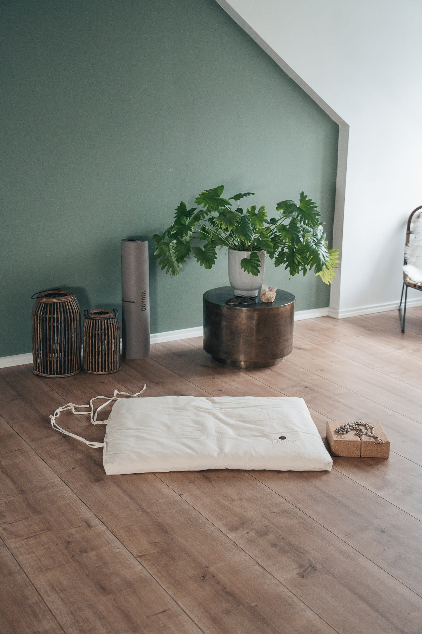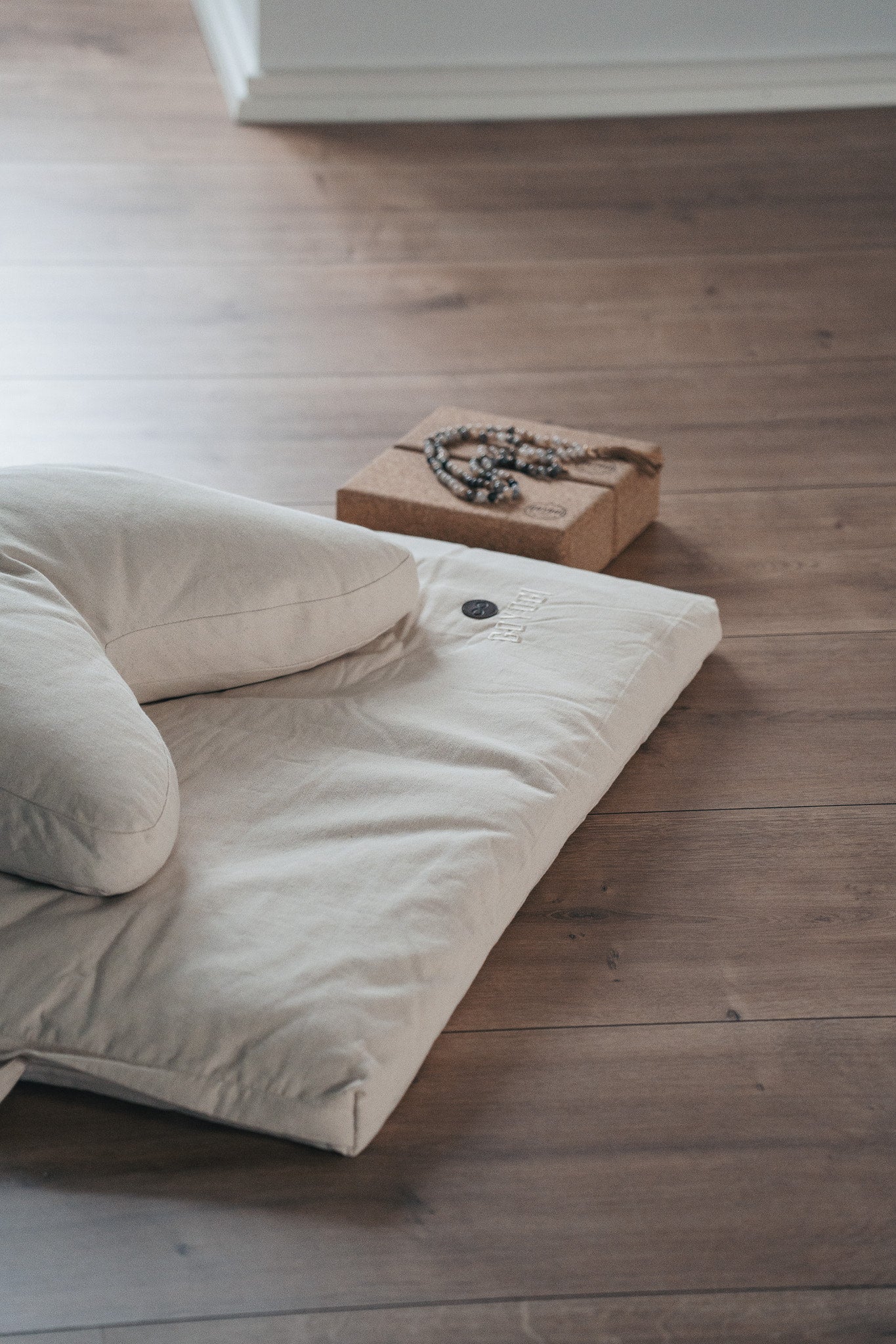 Denne zabuton er en gulvpude designet til at give støtte til knæ, underben og ankler under meditation. Med en tykkelse på 4 cm er den foldbar og udstyret med bindebånd, der gør den nem at transportere og opbevare.
