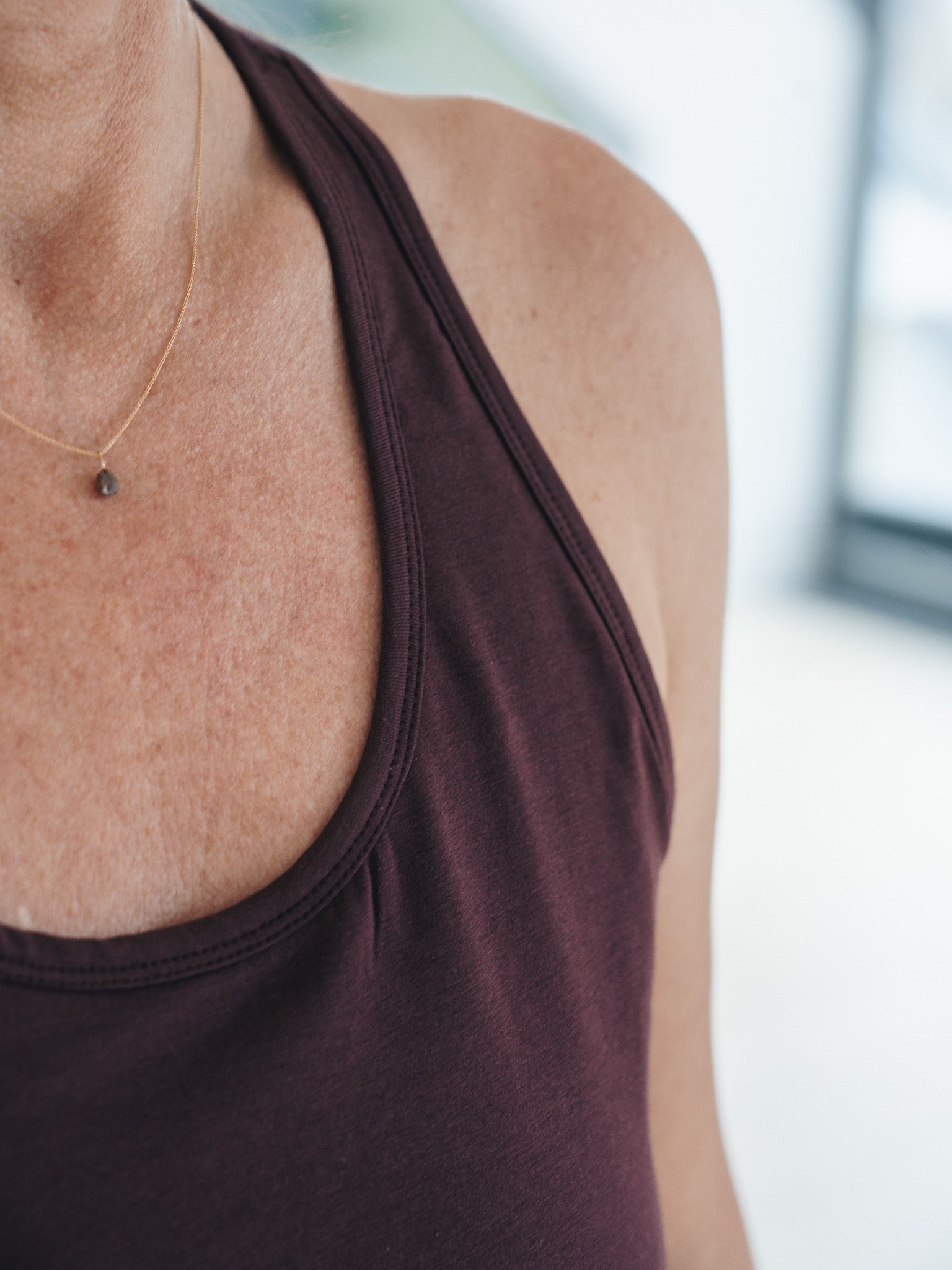 En elegant og funktionel yogatop med indbygget bh (uden indlæg), der giver dig let støtte og en følelse af frihed i alle stillinger. Den er lavet i blød økologisk bomuldsjersey med stræk og har en god længde, så du undgår, at den kravler op under din praksis. Perfekt alene eller under en løs bluse.