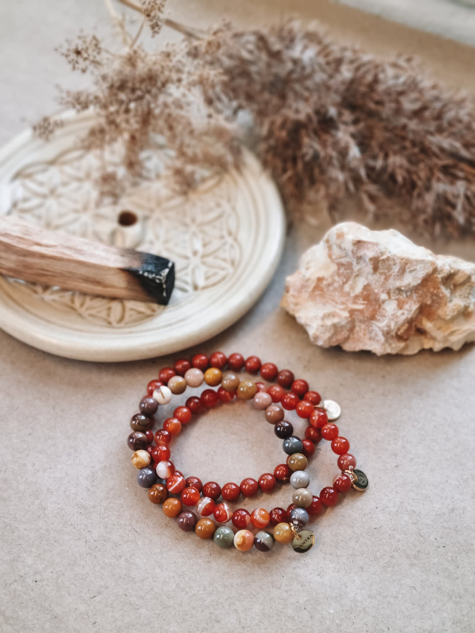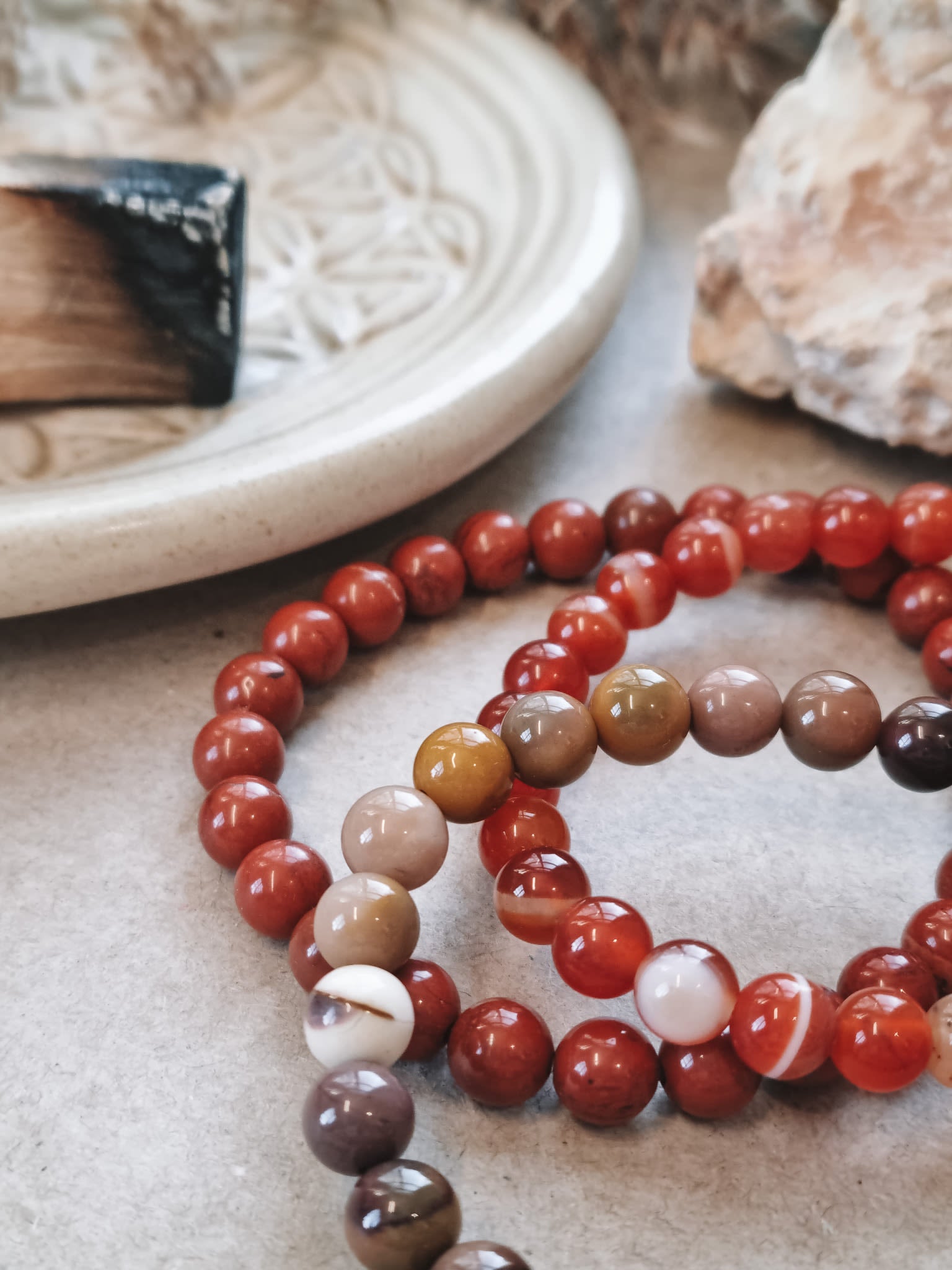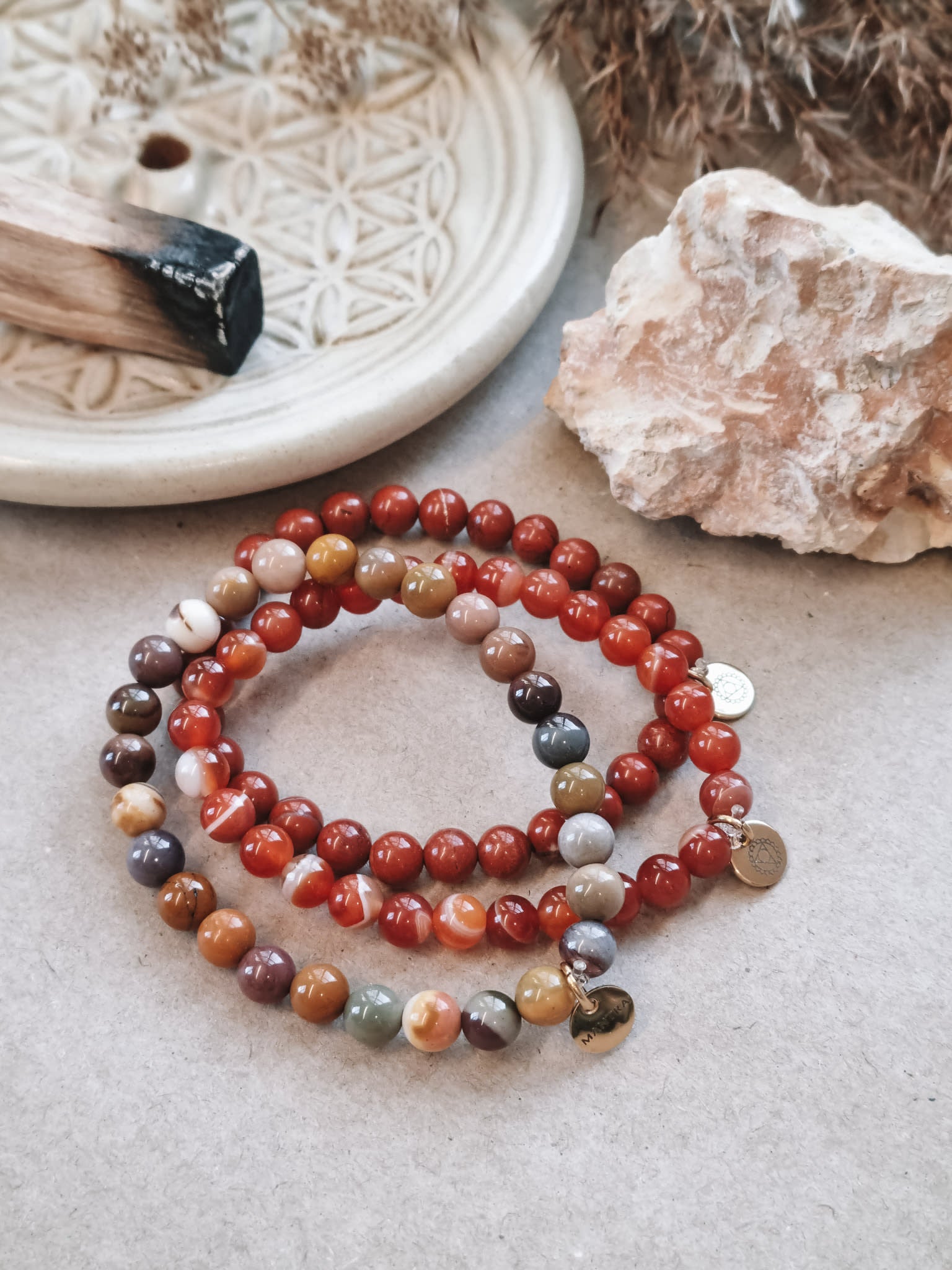 Mantra ENERGY stack med tre armbånd i henholdsvis rød jaspis, mookait og karneol.