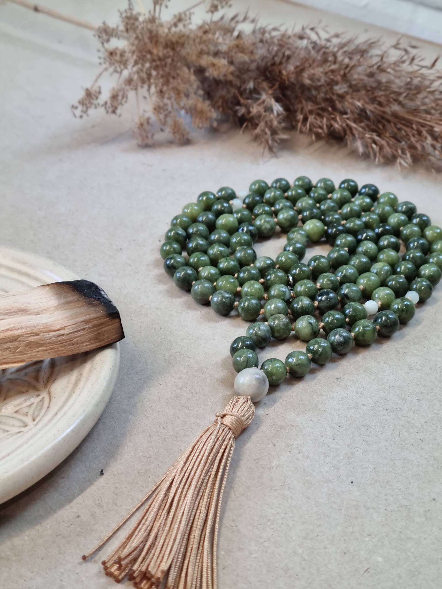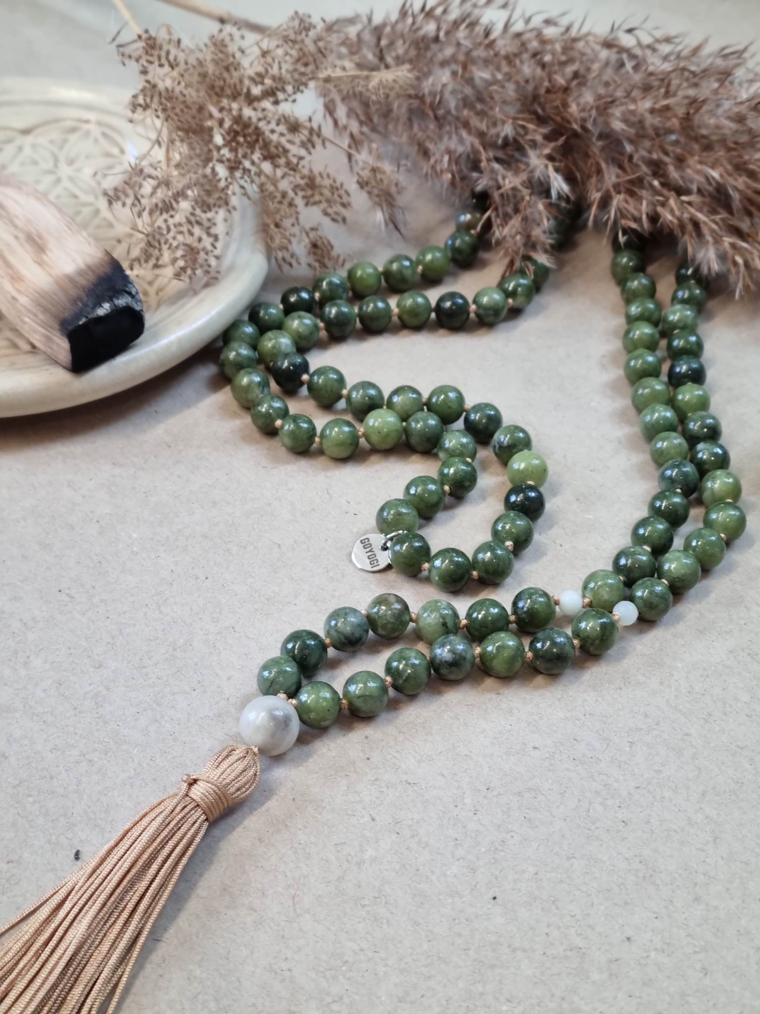 *Der kan være små farveforskelle i de naturlige sten og små variationer i antal af perler, da ikke to malaer ender med at være ens. Helhedsindtrykket af smykket kan således varierer. Den mala du køber er dog altid i samme type sten og sat på samme farve snor, som den du finder på billedet.